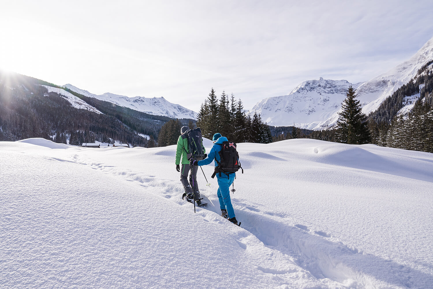 Raurisertal, Ferienregion Nationalpark Hohe Tauern: Im Rauriser Talschluss Kolm Saigurn gibt es einen markierten Schneeschuhtrail, der vom Alpengasthof Bodenhaus (1.280 m) bis zum Ammererhof und Naturfreundehaus (1.600 m) am Fuße des Hohen Sonnblicks führt (ca. 4 km, 320 hm und 3 h Gehzeit – einfache Strecke!). Auf dem Rückweg geht´s schneller: Du kannst dir bei den beiden Talschlusswirten einen Schlitten leihen und über die Mautstraße zurückrodeln. Ein weiteres Highlight ist die Tour durch den Rauriser Urwald. Das Tourismusbüro bietet von Ende Dezember bis Ende März geführte Schneeschuhwanderungen mit einem Nationalpark Ranger an.