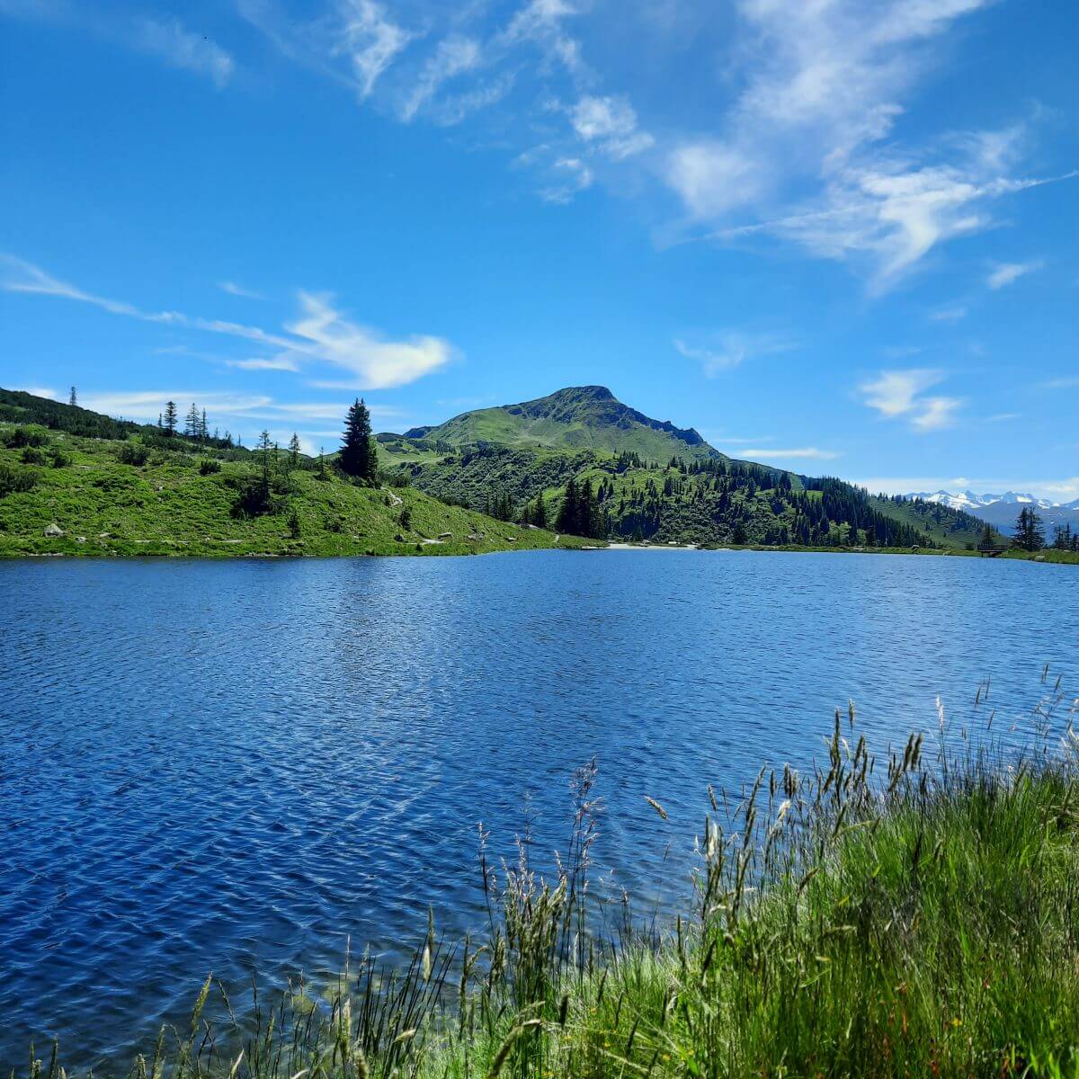 We begin our hike and, after a pleasant walk along forestry lanes and forest pathways taking less than one hour, we reach the Kreuzjöchlsee. There, we treat ourselves to a first break along with a great view of the Wilder Kaiser.