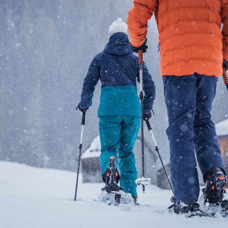 Warm, flexibel und mit viel Bewegungsfreiheit: So sieht die ideale Sportkleidung zum Schneeschuhwandern aus. So ist es einerseits wichtig, sich vor den rauen Elementen des Winters zu schützen, andererseits werden Sie nach kurzer Zeit durch die sportliche Betätigung ins Schwitzen geraten. Mit Kleidung nach dem Zwiebelschalenprinzip, auch Layering genannt, liegen Sie immer goldrichtig. So können Sie bei Bedarf Schichten aus- oder wieder anziehen. Anschmiegsame, wärmende und atmungsaktive Unterwäsche ist die Basis, um sich wohlzufühlen. Hierbei können Sie zum Beispiel auf Thermo-/Skiunterwäsche oder Funktionsunterwäsche zurückgreifen. Packen Sie ein zweites Paar zum Wechseln ein, falls Sie stärker ins Schwitzen geraten, denn die Kombination „außen Kälte – innen Nässe“ gilt es tunlichst zu vermeiden. Empfehlenswert sind zudem ein Sport-BH sowie Wandersocken. Sind Ihre Winterstiefel nicht hoch genug, können auch Gamaschen hilfreich sein, um die Füße trocken zu halten und ein Eindringen des Schnees in Ihre Schuhe zu verhindern.
