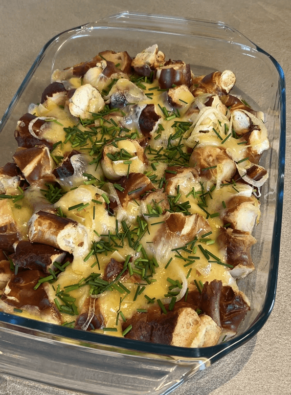 - Bergkäse reiben oder klein würfeln und abwechselnd mit den Brezen in der Form schichten.
