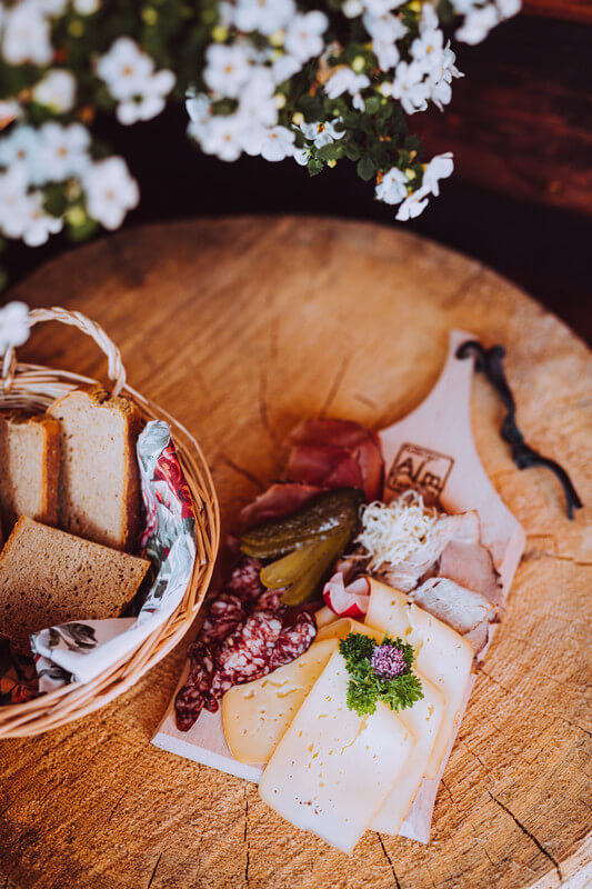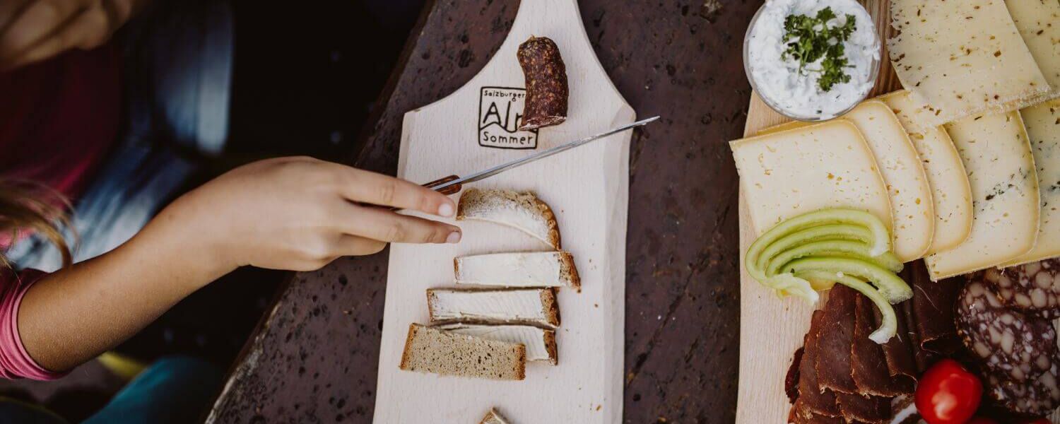 Zu den typischen Schmankerln auf einer bewirtschafteten Almhütte im Salzburger Land zählen die Brettljause, knuspriges Bauernbrot mit Almbutter, Speck, (Wild-) Wurst und Käse. Letzter variiert von Region zu Region, im Lammertal ist man zum Beispiel stolz auf den Tennengauer Almkäse.