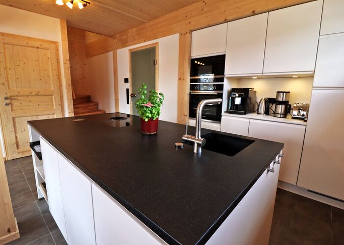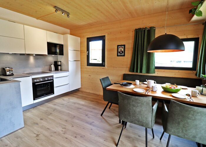 Große Fenster und Terrassen (teils eingezäunt) schaffen eine direkte Verbindung zur Natur. Die großzügige Küchenausstattung sorgt für Unabhängigkeit, warme Holzakzente für gemütliche Atmosphäre.