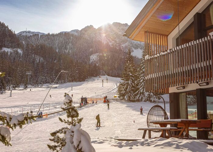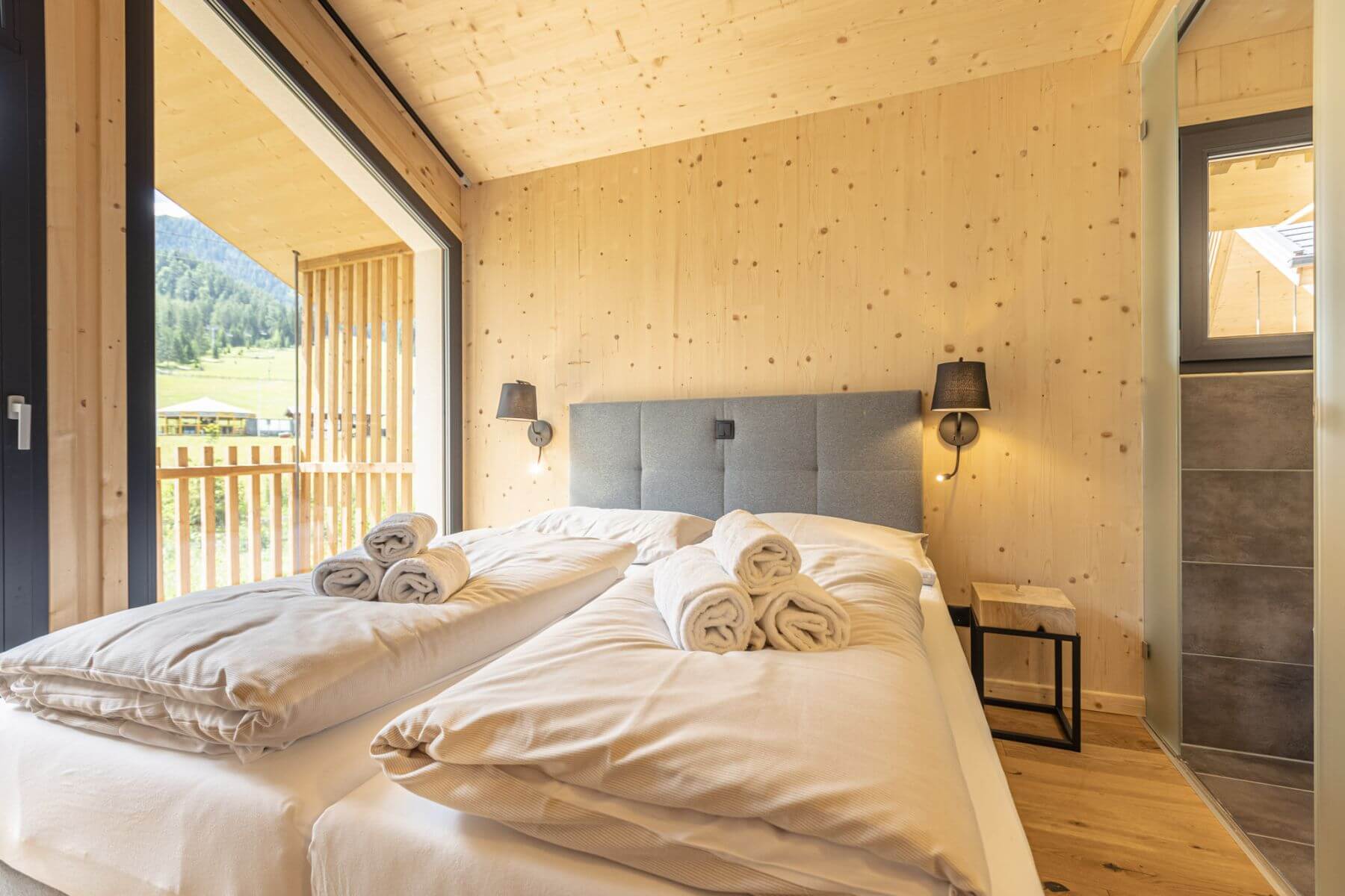 Die Chalets aus Massivholz sind in unterschiedlichen Kategorien buchbar und alpin-modern eingerichtet. Eine voll ausgestattete Küche, 4 Schlafzimmer, 2 Bäder und ein großzügiger Wohnbereich mit Panoramaglasfront bieten viel Raum für gemeinsame Stunden. In einigen Chalets sorgt ein Kamin für zusätzliche Gemütlichkeit. Der private Wellnessbereich mit Sauna und Außenbadewanne sowie die Lage direkt an der Piste zählen zu den Highlights der Alpenchalets Biberwier Zugspitze. Im Winter startest du direkt von deiner Unterkunft mit den Skiern zur Talstation der Marienbergbahn oder mit den Kindern ins Biberland mit Förderband. Im Sommer bringt dich die 6er-Sesselbahn zum Start der Sommerrodelbahn, in ein familienfreundliches Wandergebiet und zu abwechslungsreichen Biketrails. Auch ein Ausflug zur Zugspitze, Deutschlands höchstem Berg, ist nur 8 km entfernt.