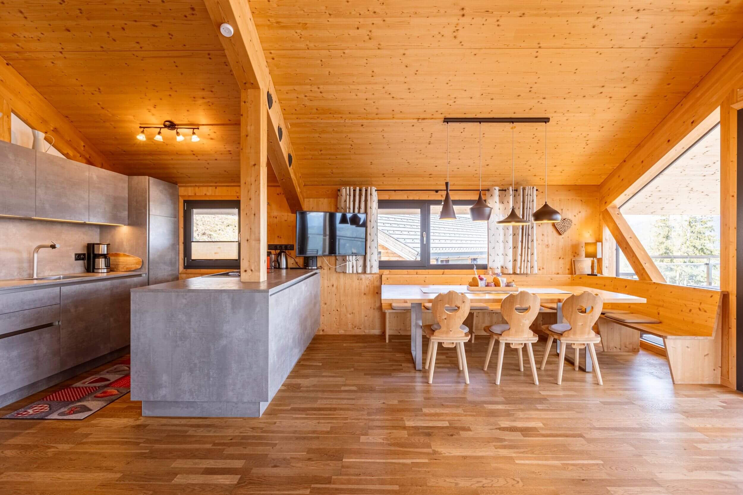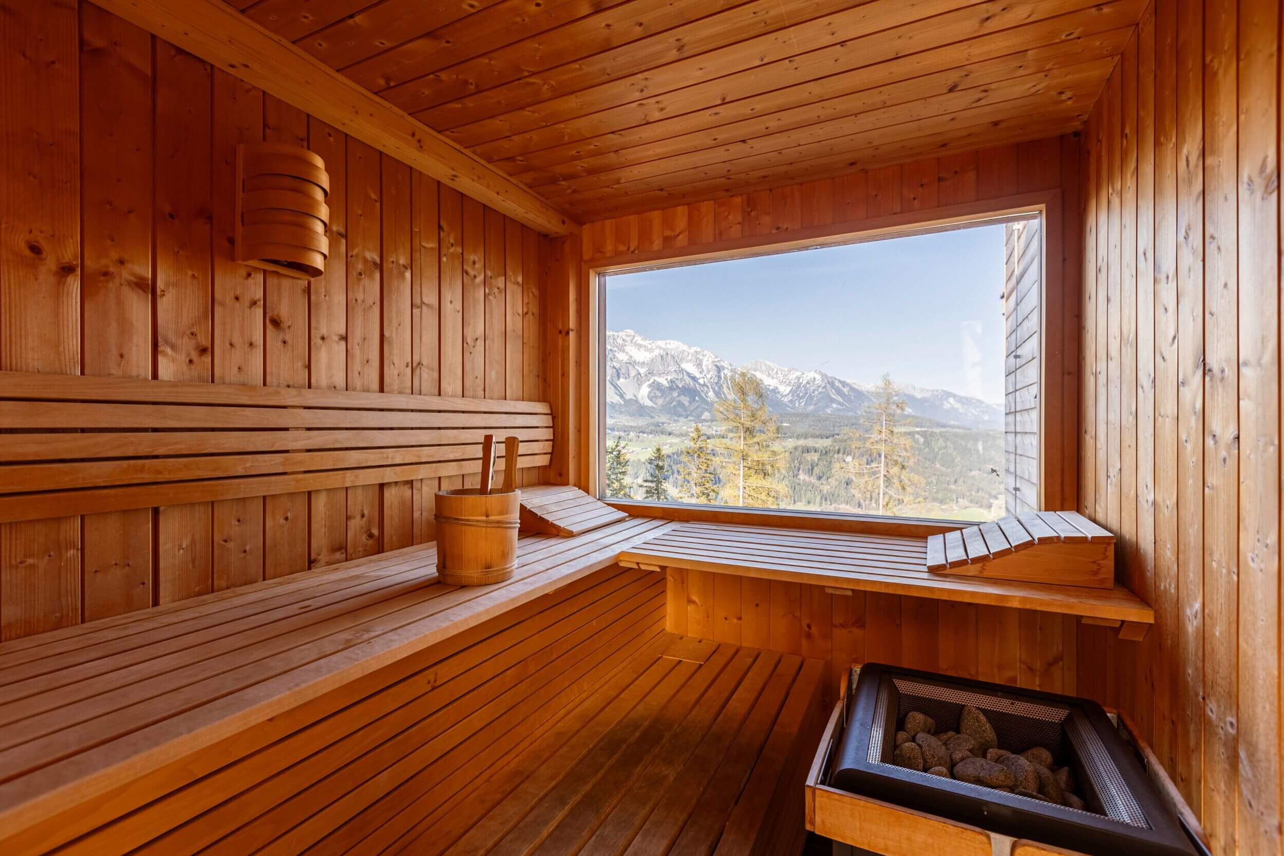 Lassen Sie sich von den ersten Sonnenstrahlen, durch das große Panoramafenster wecken. Genießen Sie einen imposanten Ausblick auf den Dachstein und auf Schladming. Auch die Ausstattung Ihres Ruhepols lässt keine Wünsche übrig. Hochwertige Designermöbel, eine vollausgestattete Küche und vor allem die Wellnesseinrichtungen begeistern Familien, Freundesgruppen und all jene, die im Herzen der Steiermark ausspannen möchten. Nach einem aufregenden Skitag in oder nach einer ausgiebigen Wandertour tanken Sie in der Sauna, in der Indoor-Whirlwanne oder im Outdoor-Whirlpool neue Kräfte. Erholung im Chalet war noch nie so einfach.