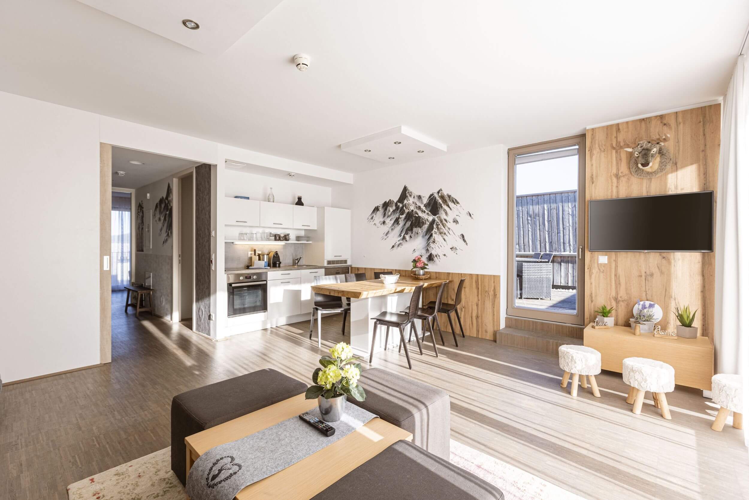 Die Ferienwohnungen in Rohrmoos verfügen über großzügige Balkone und sonnige Terrassen. Zum Teil gibt es bis zu 40 m² große Dachterrassen. Insgesamt haben Sie die Wahl zwischen sechs unterschiedlichen Apartmenttypen – angefangen bei gemütlichen Ferienwohnungen in Schladming für Paare, bis hin zu großzügigen Apartments für einen erholsamen Familienurlaub in der Steiermark.