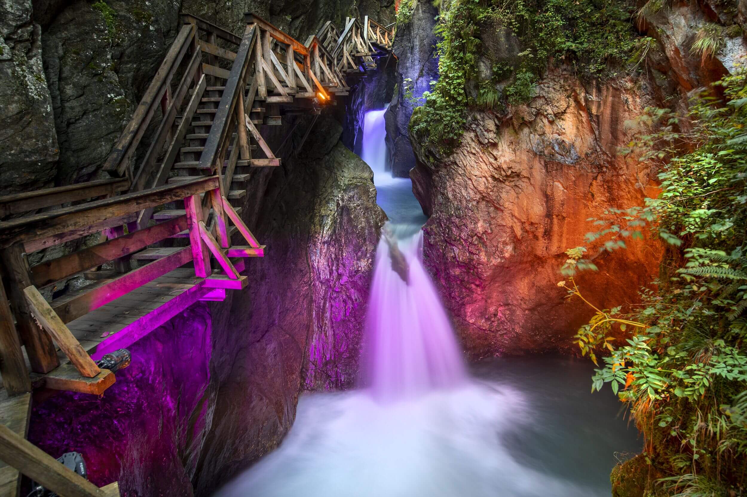 Die Sigmund Thun Klamm in Kaprun zählt zu den eindrucksvollsten Naturdenkmälern der Region. Auf rund 320 m Länge bahnt sich die Kapruner Ache ihren Weg durch bis zu 30 m hohe, steil aufragende Felswände, begleitet von tosendem Gletscherwasser und spektakulären Wasserschauspielen. Ein gesicherter Holzsteg führt direkt über das Wasser und bietet faszinierende Einblicke in die Naturgewalten. Am Ende der Klamm erwartet Sie der türkis schimmernde Klammsee mit Kinderspielplatz.