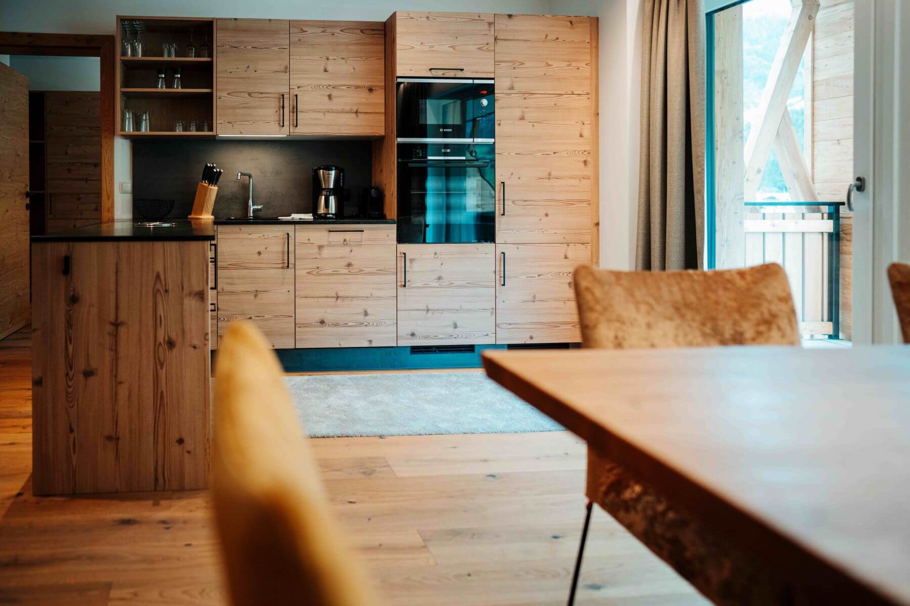 In den Ferienwohnungen und den öffentlichen Bereichen des neuen Resorts wurden hochwertige heimische Materialen verarbeitet wie etwa Rauriser Naturstein und Lärchenholz. Genießen Sie von jedem Apartment aus den herrlichen Blick in die Natur und auf die Goldberggruppe.