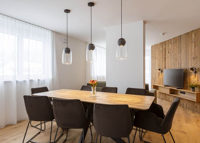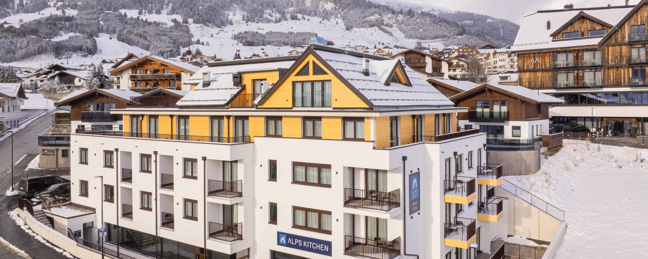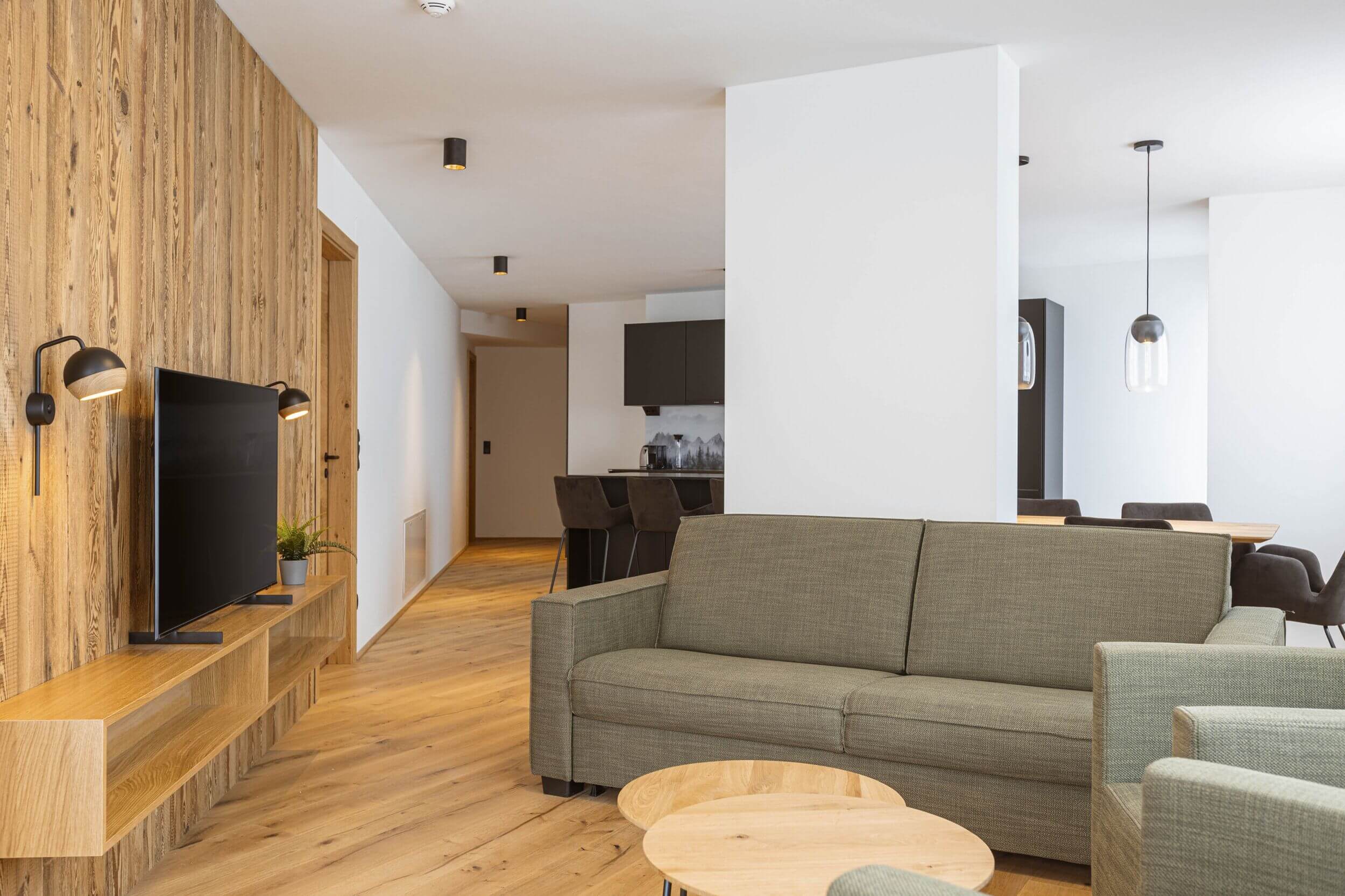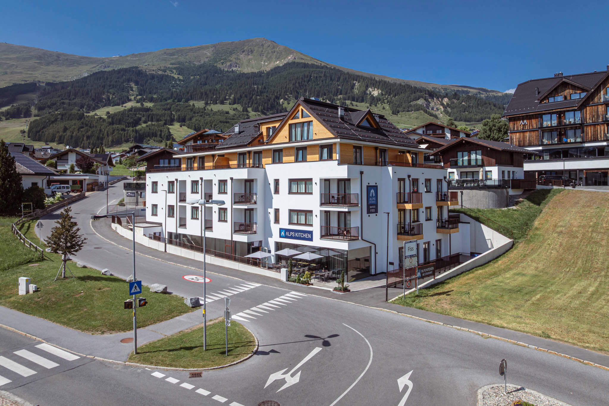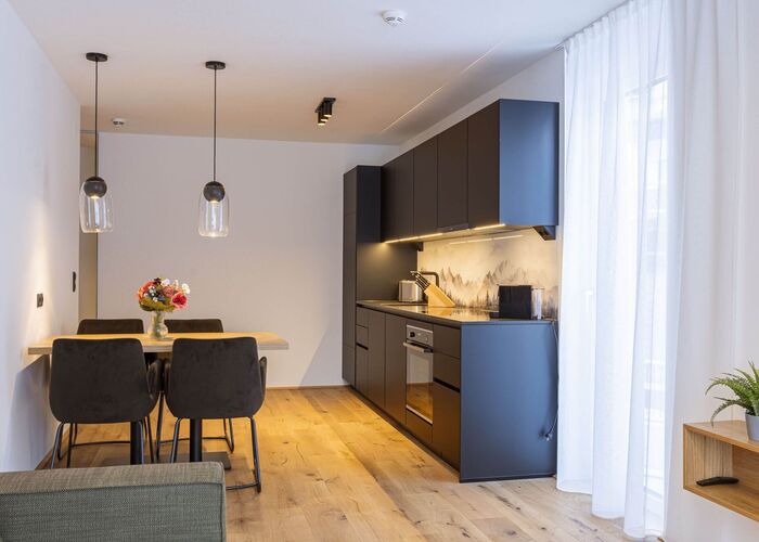 Bei der Einrichtung der Ferienwohnungen wurde großer Wert auf hochwertige Materialien gelegt: komfortable Boxspringbetten, voll ausgestattete Einbauküchen, gemütliche Sofas und moderne Tapeten schaffen ein edles Wohngefühl. Ein besonders harmonisches Ambiente, das sich auch im Wellnessbereich und im Restaurant ALPS KITCHEN wiederfindet.