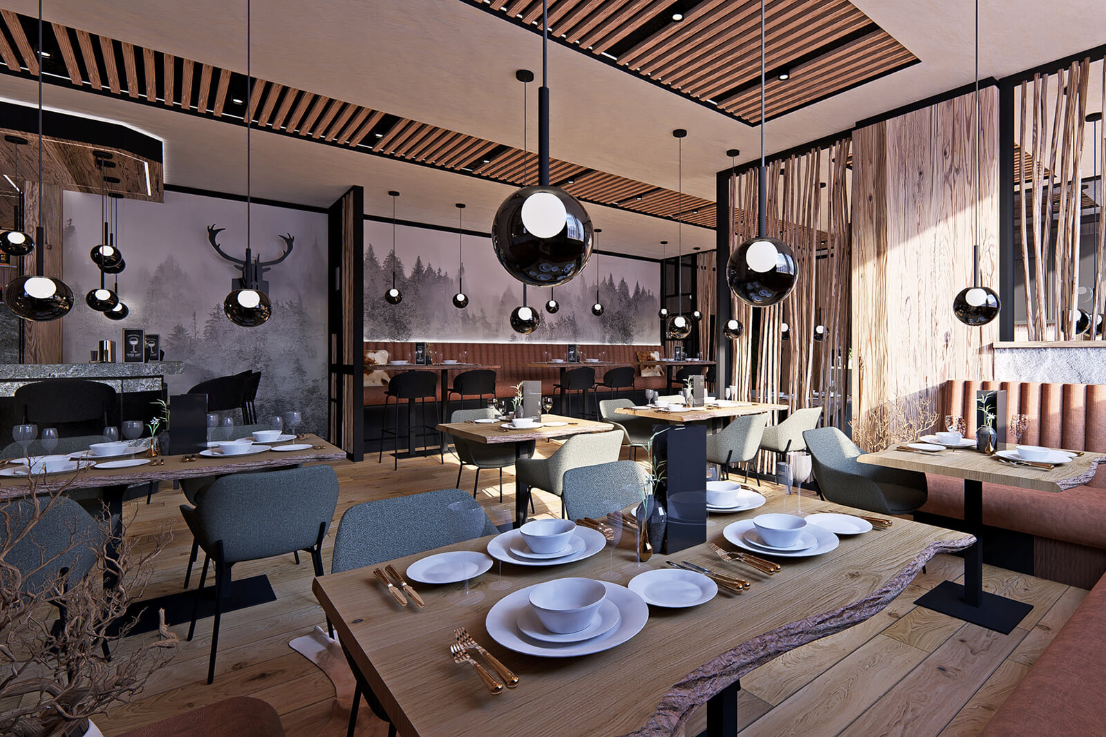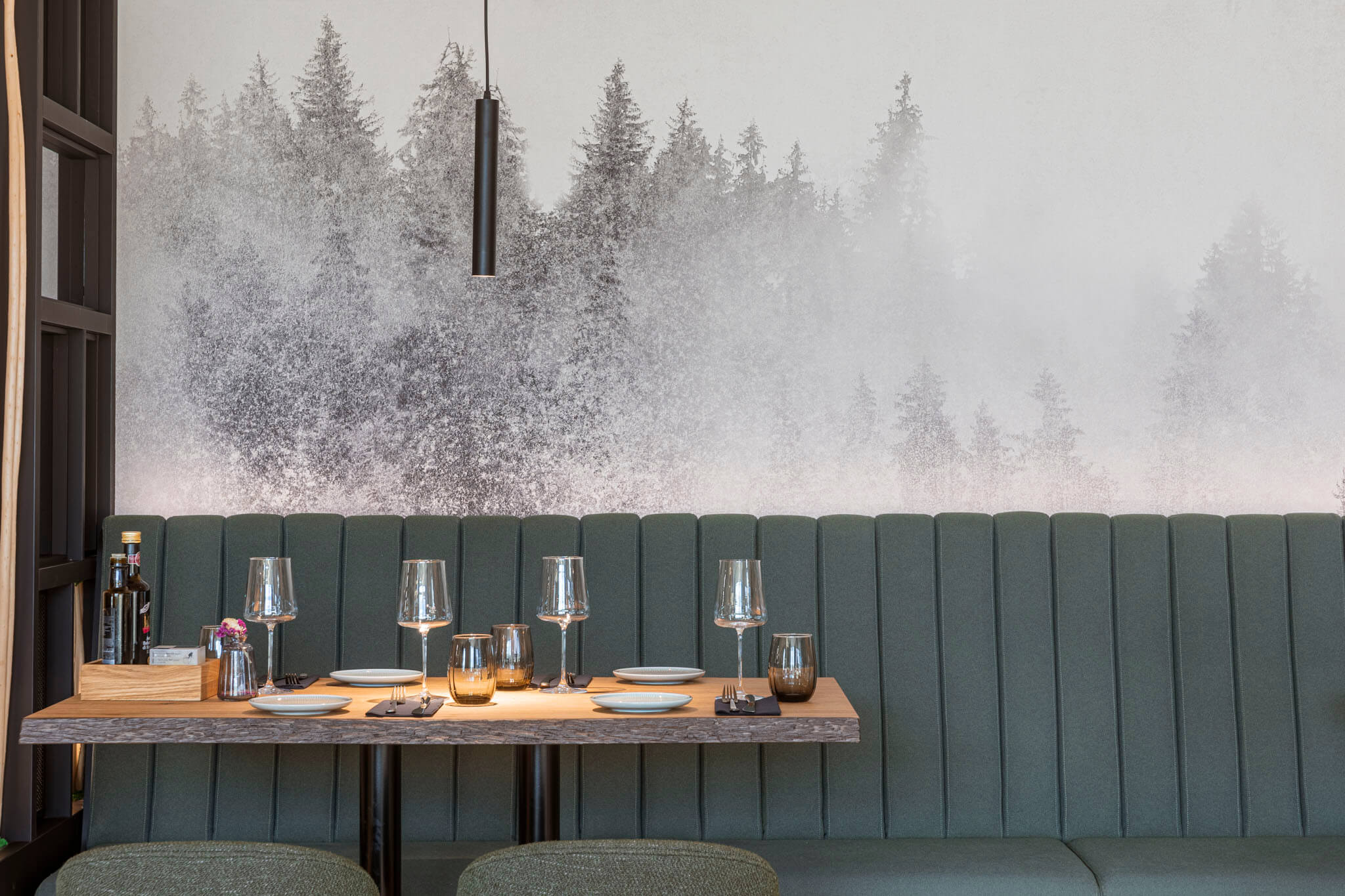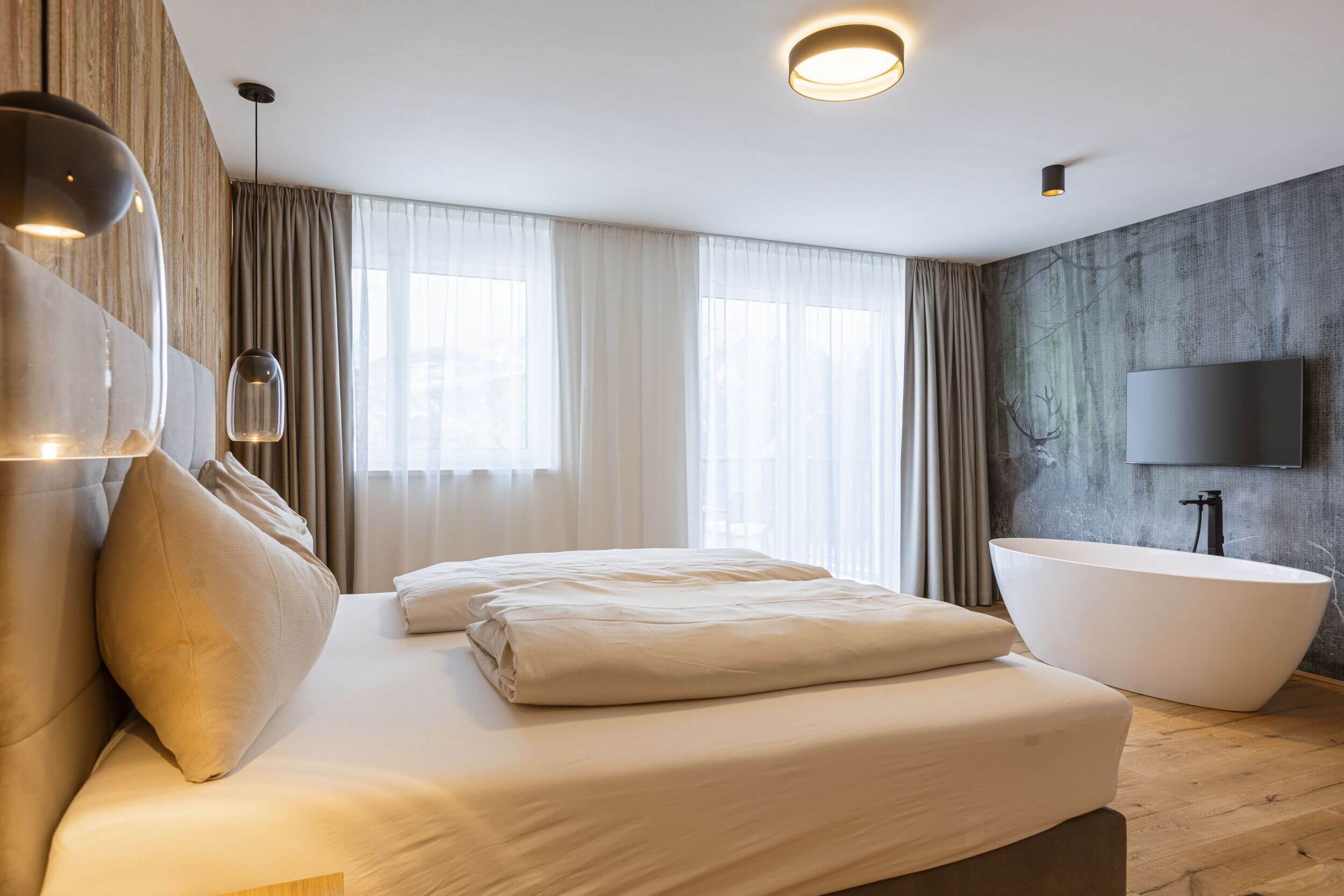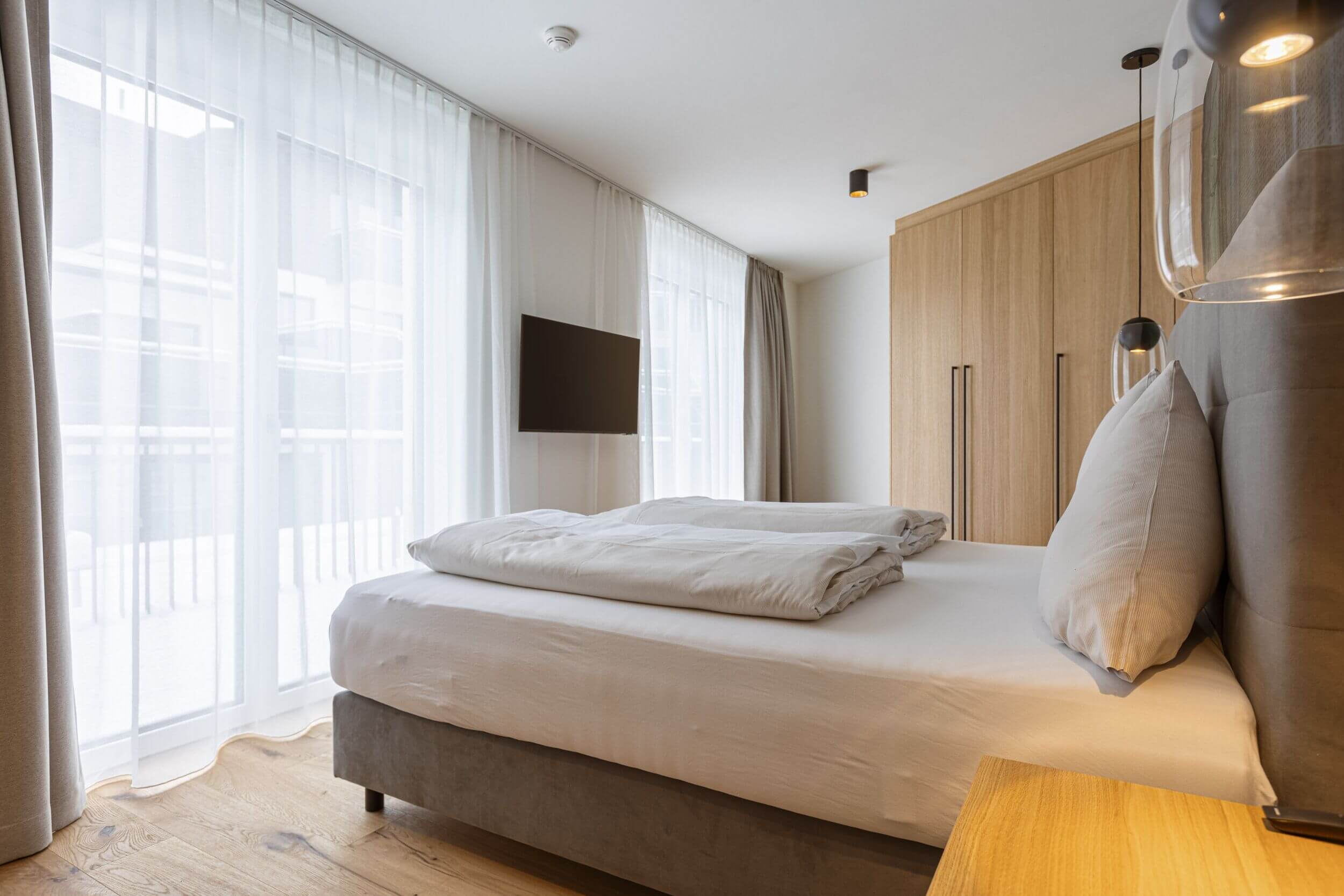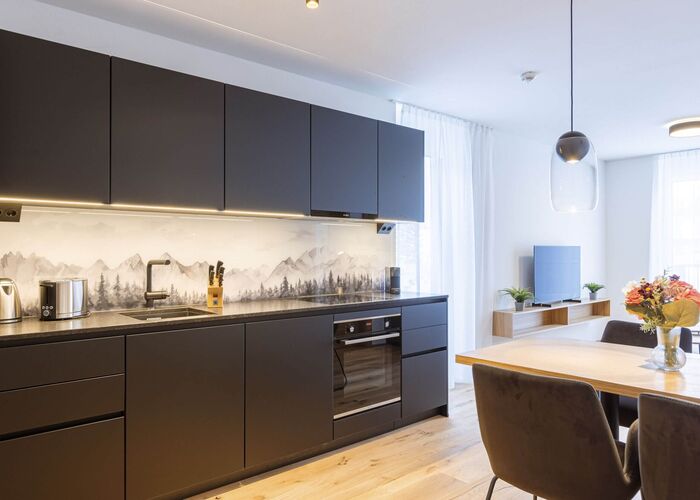 Bei der Einrichtung der Ferienwohnungen wurde großer Wert auf hochwertige Materialien gelegt: komfortable Boxspringbetten, voll ausgestattete Einbauküchen, gemütliche Sofas und moderne Tapeten schaffen ein edles Wohngefühl. Ein besonders harmonisches Ambiente, das sich auch im Wellnessbereich und im Restaurant ALPS KITCHEN wiederfindet.