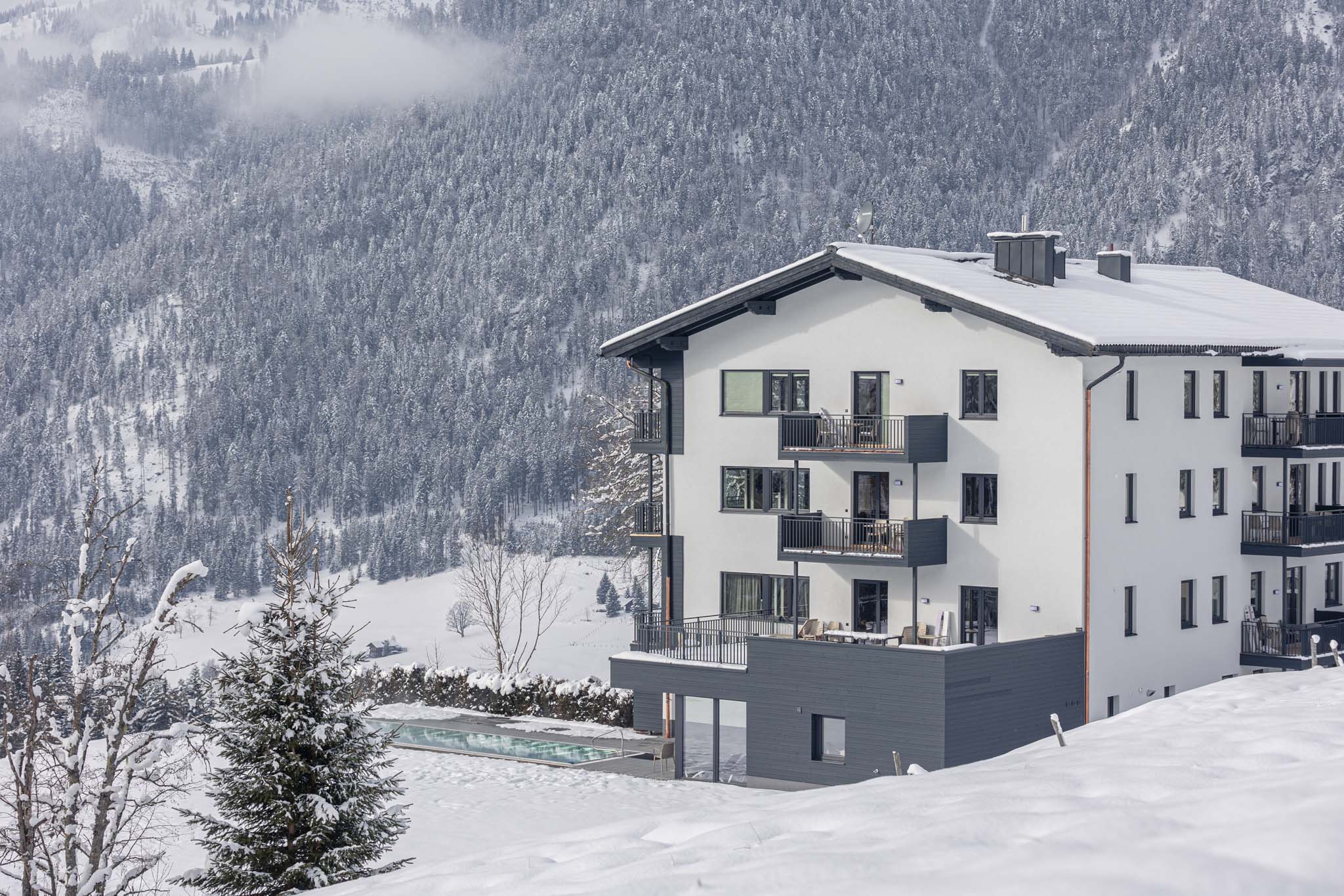 Entspannung zu jeder Jahreszeit: Im Wellnessbereich erwartet dich eine Finnische Sauna mit Blick auf den Infinity-Pool. Dieser ist beheizt und lädt das ganze Jahr über zum Schwimmen oder entspannten Treibenlassen ein. Der Panoramablick vom Pool und Sonnendeck aus ist ein echtes Highlight – hier hast du Lammertal, Tennengebirge und das Dachstein Massiv bestens im Blick.