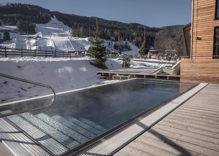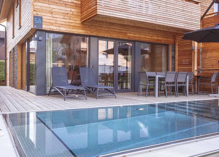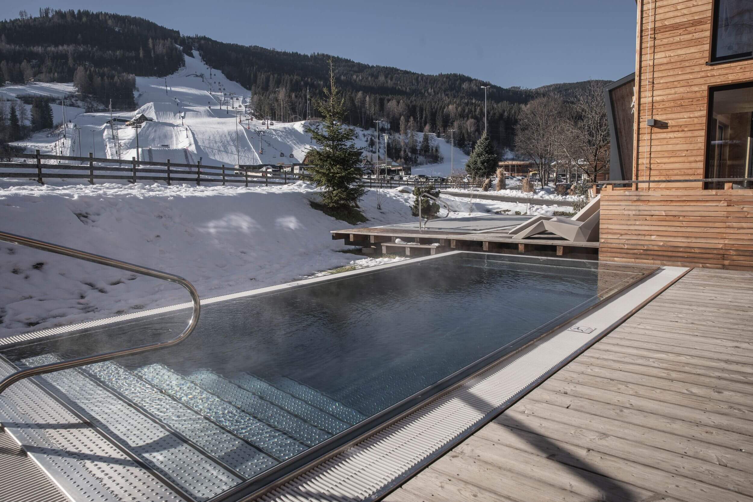 Jede Einheit verfügt zudem über eine eigene Finnische Sauna, die nach einem Tag auf der Piste oder einer ausgiebigen Wanderung wohltuende Regeneration bietet. Dank der ganzjährig nutzbaren Pools und der Kombination aus Wasser, Wärme und beeindruckendem Bergblick wird dein Aufenthalt zu einer besonders erholsamen Auszeit.