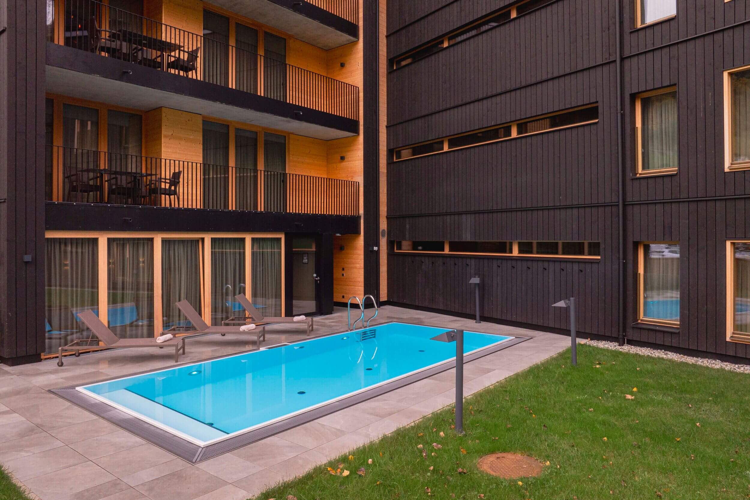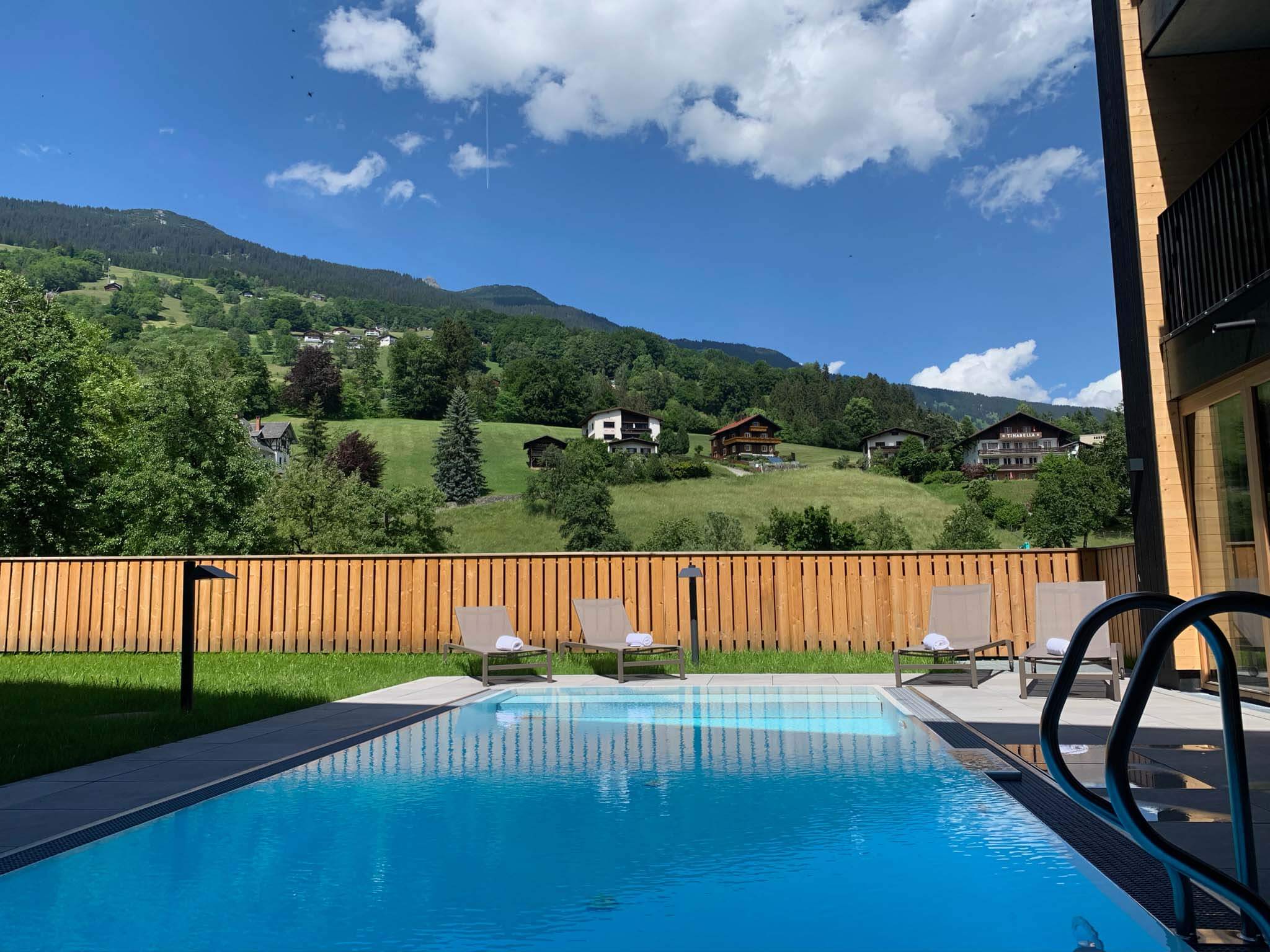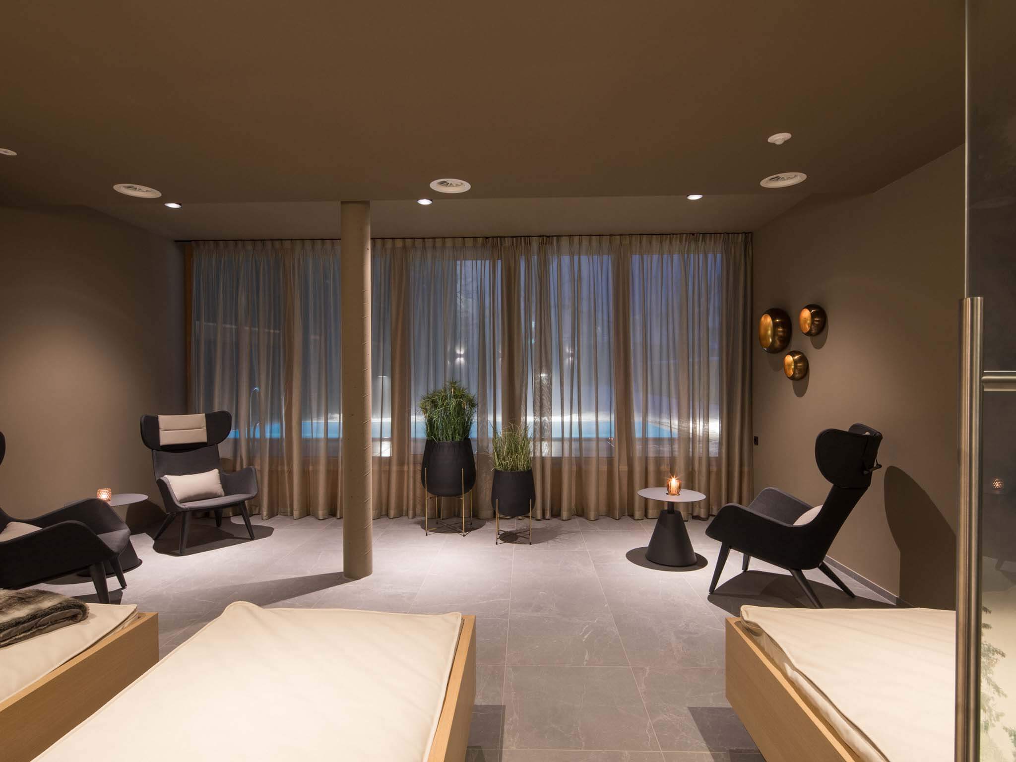 Das exklusive Ambiente ist auch im Wellnessbereich des Resorts allgegenwärtig. Ruhen Sie sich in der Sauna oder im Dampfbad aus, lassen Sie sich im beheizten Außenpool entspannt treiben und genießen Sie dabei die Aussicht auf die umliegende Bergwelt. Der Ruhebereich ist mit bequemen Liegen und Sitzmöglichkeiten ausgestattet und der ideale Ort zum Entschleunigen und Relaxen.