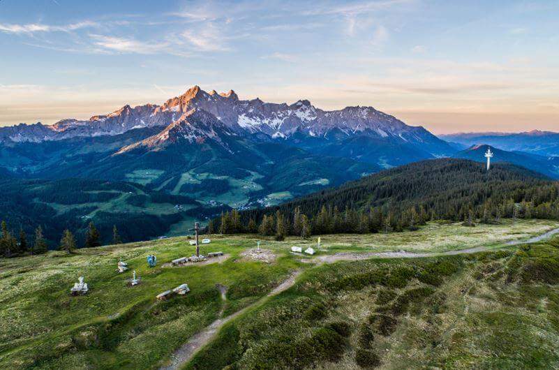 Der Dachstein, die Bischofsmütze, das Tennen- und Hagengebirge, der Hochkönig, die Hohen Tauern, der Großvenediger bis hin zum Großglockner – am Gipfel des Rossbrands auf knapp 1.770 Metern Höhe erwartet Sie ein atemberaubendes 360°-Bergpanorama. Der Ausblick auf über 150 markante Berggipfel lässt nach fast drei Stunden Gehzeit sämtliche Anstrengungen und Mühen vergessen. Von Radstadt gelangen Sie über die Bürgerbergalm (Weg 462) oder über den Berggasthof Rohrmoos (Weg 461) auf den Gipfel. Über die gut ausgebaute und mautfreie Panoramastraße gelangen selbst Familien Kindern auf den Gipfel, den Sie in knapp 20 Gehminuten vom Parkplatz unterhalb des Gipfels erreichen.